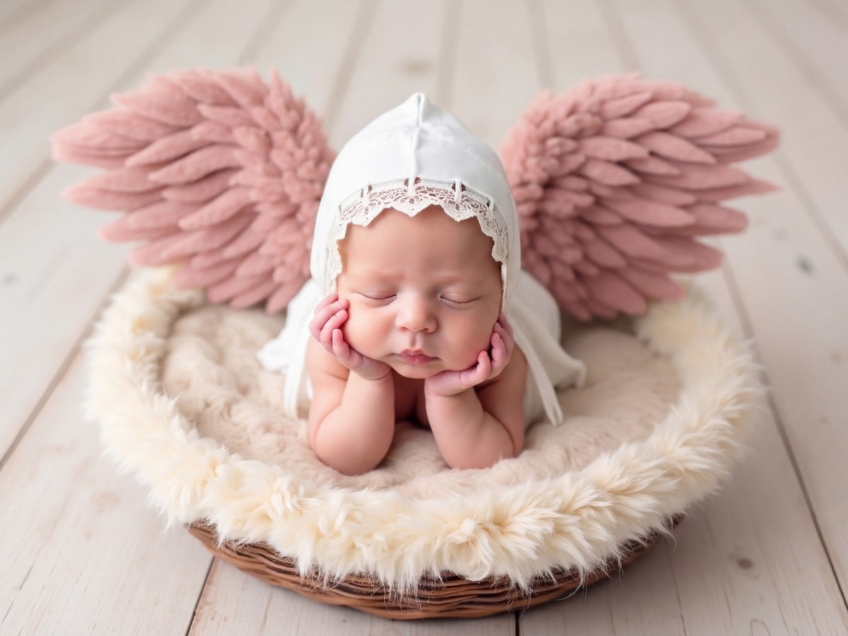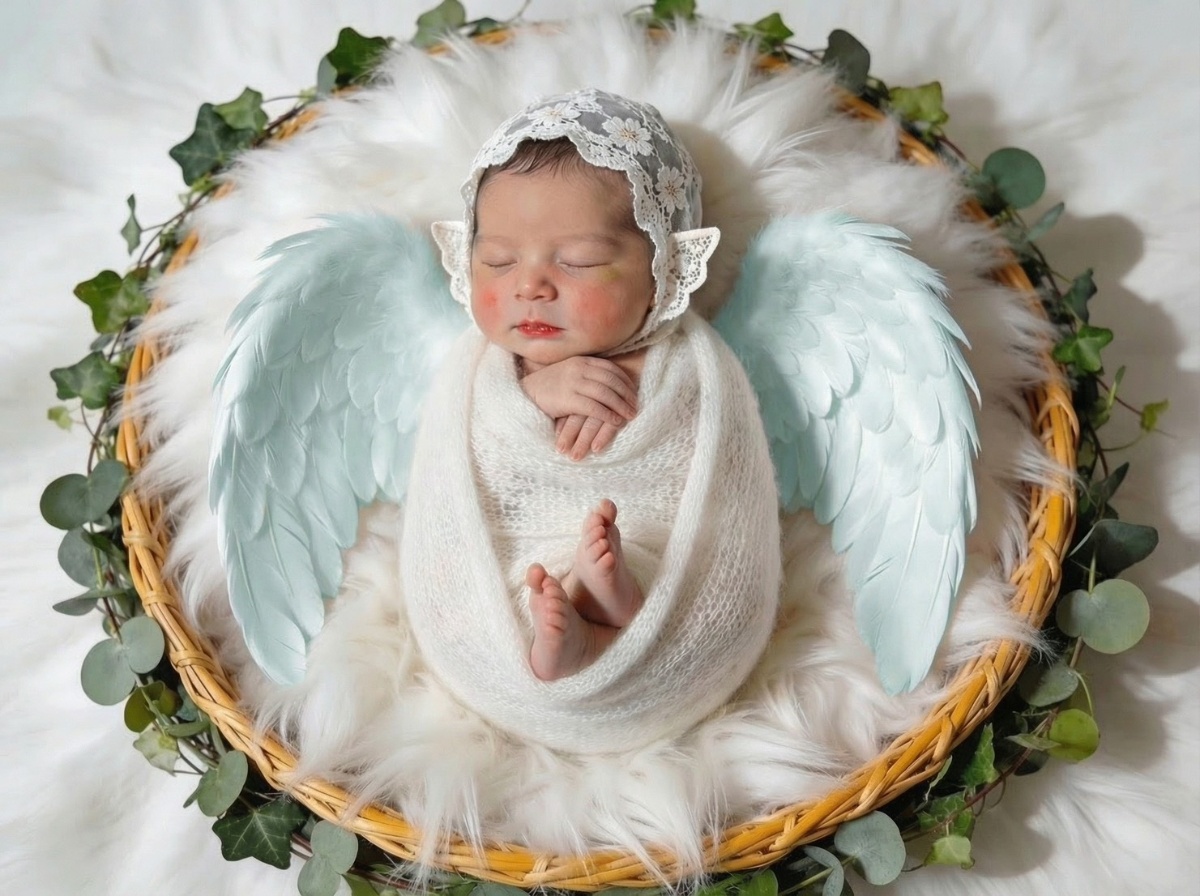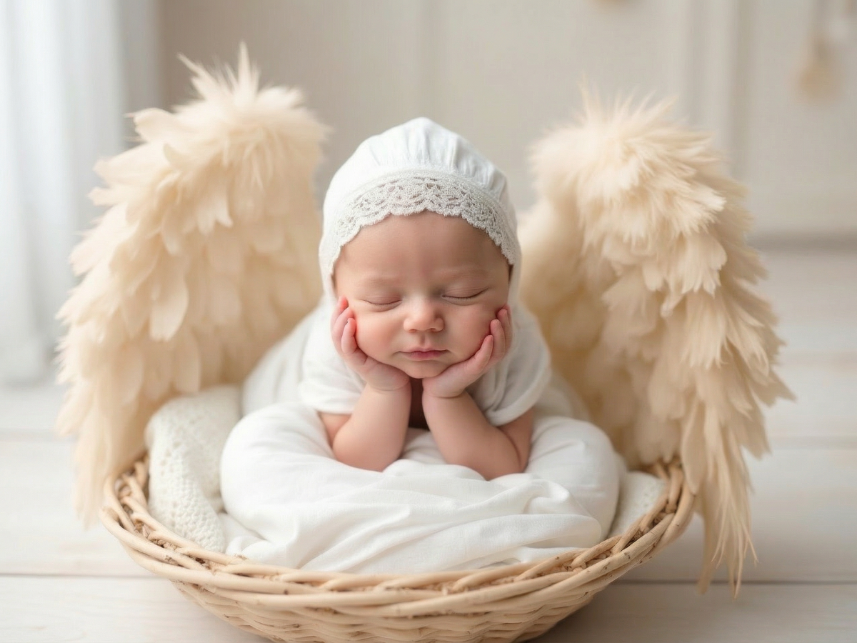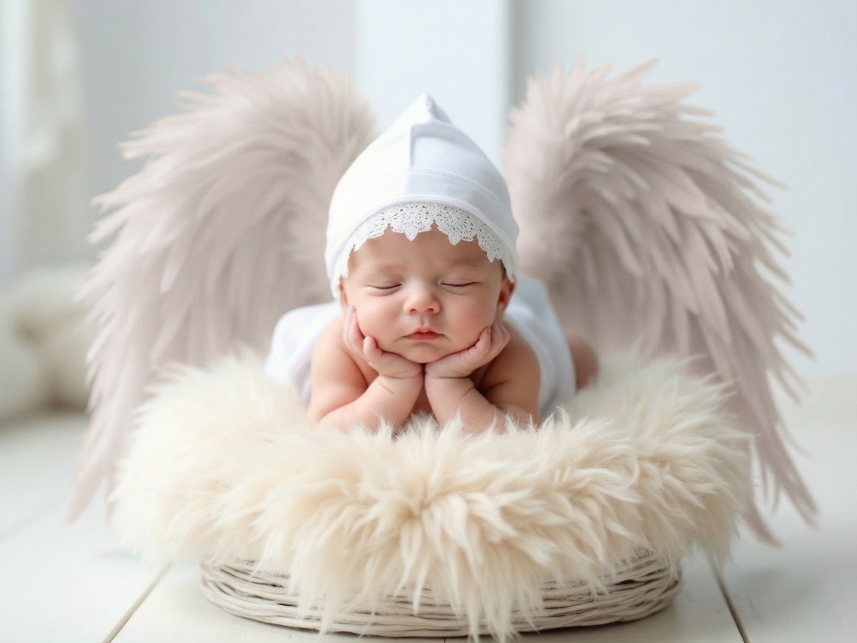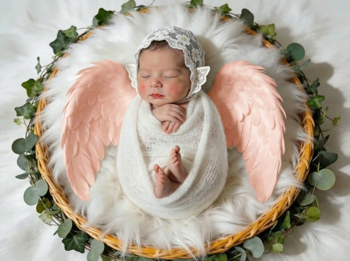 寝顔の写真をもとに、やわらかな質感と透明感をAIで丁寧に整え、天使の世界観に仕上げるプランです。