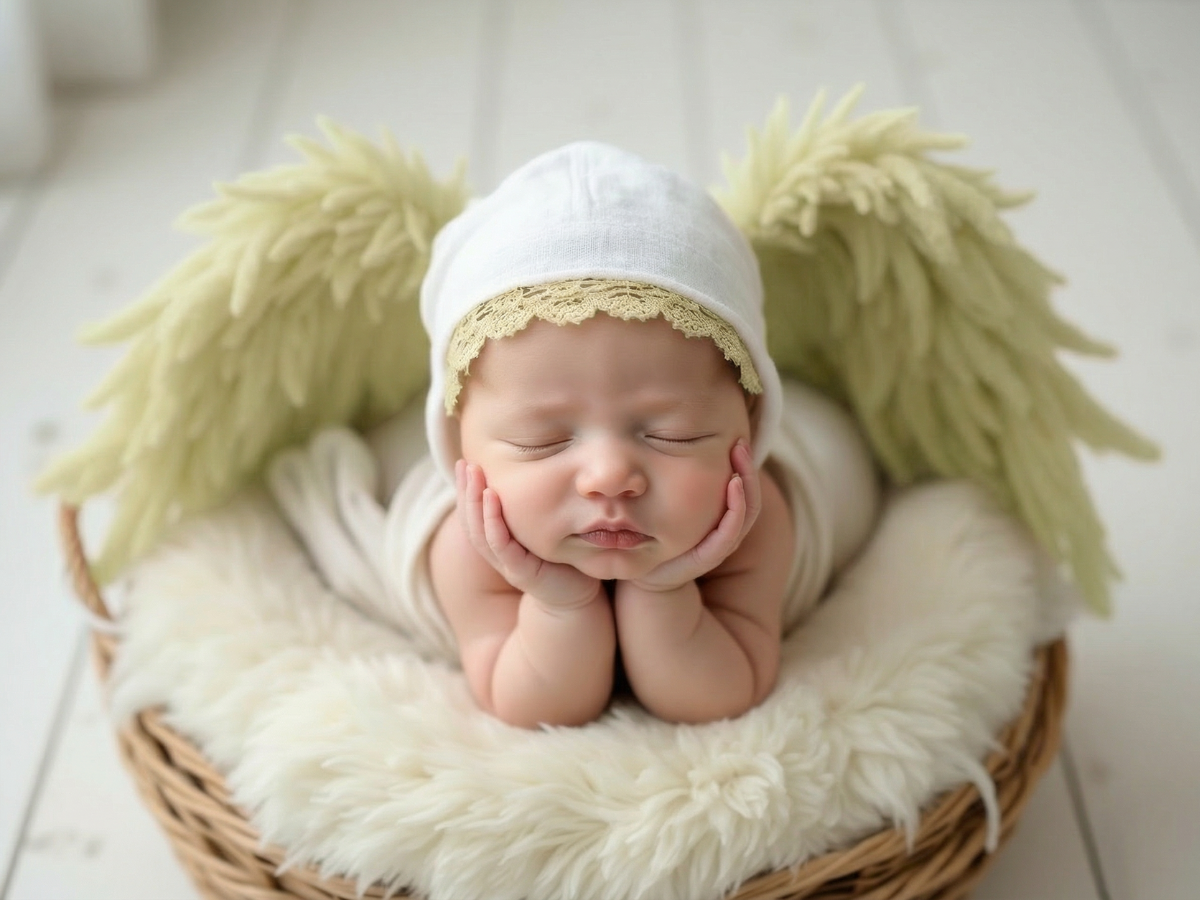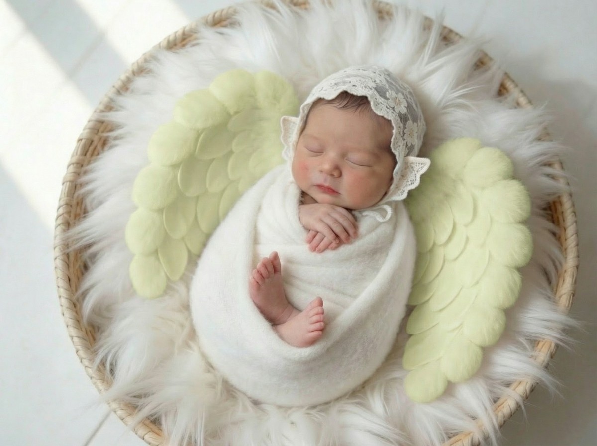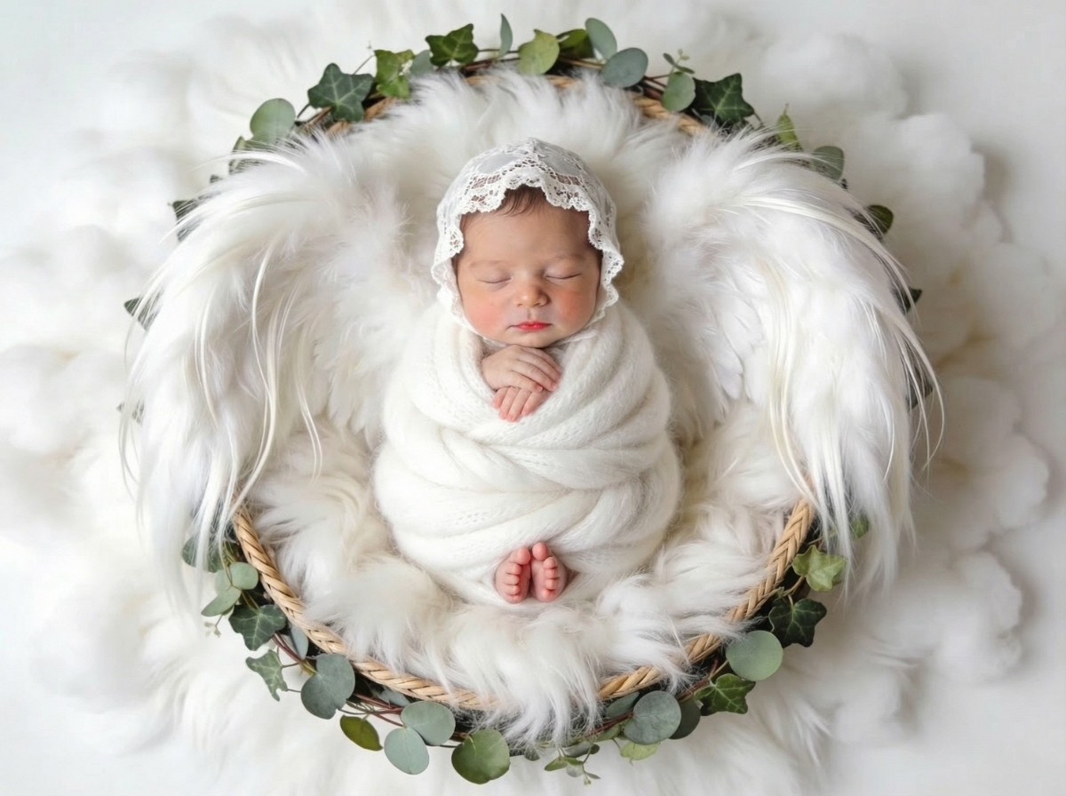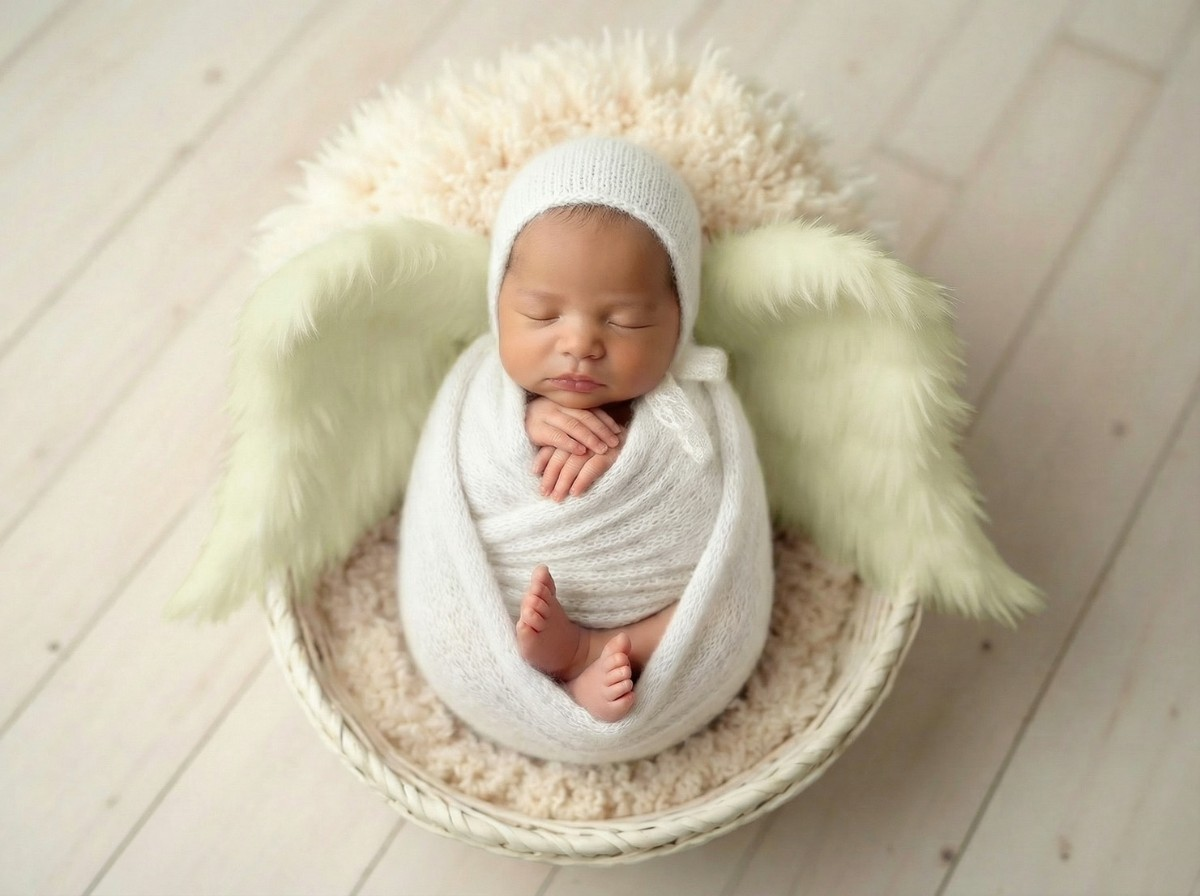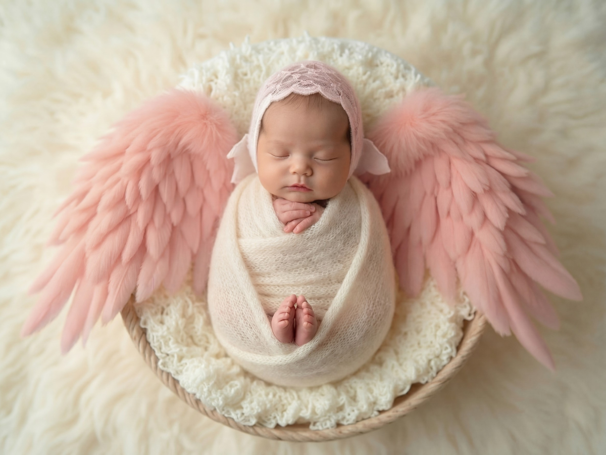 寝顔の写真をもとに、やわらかな質感と透明感をAIで丁寧に整え、天使の世界観に仕上げるプランです。