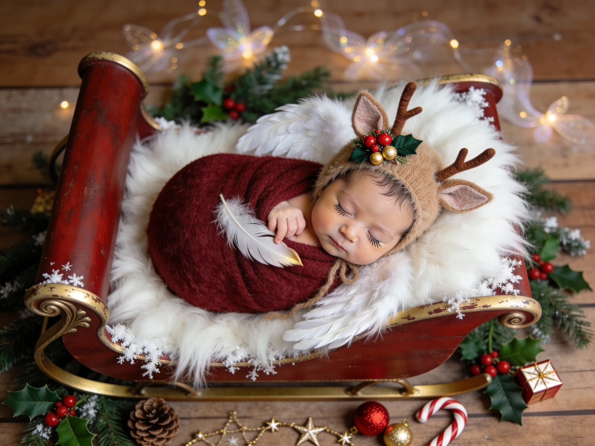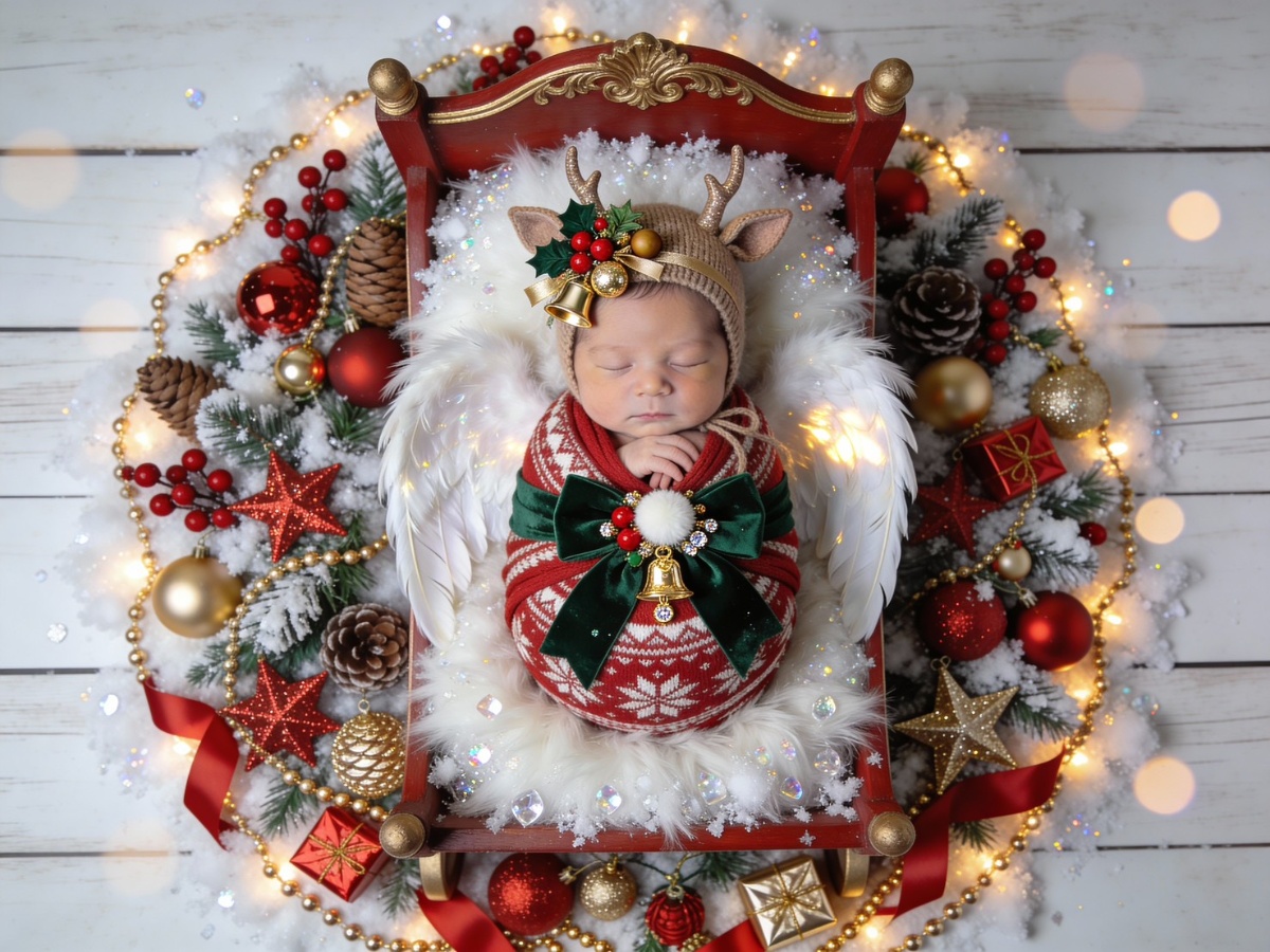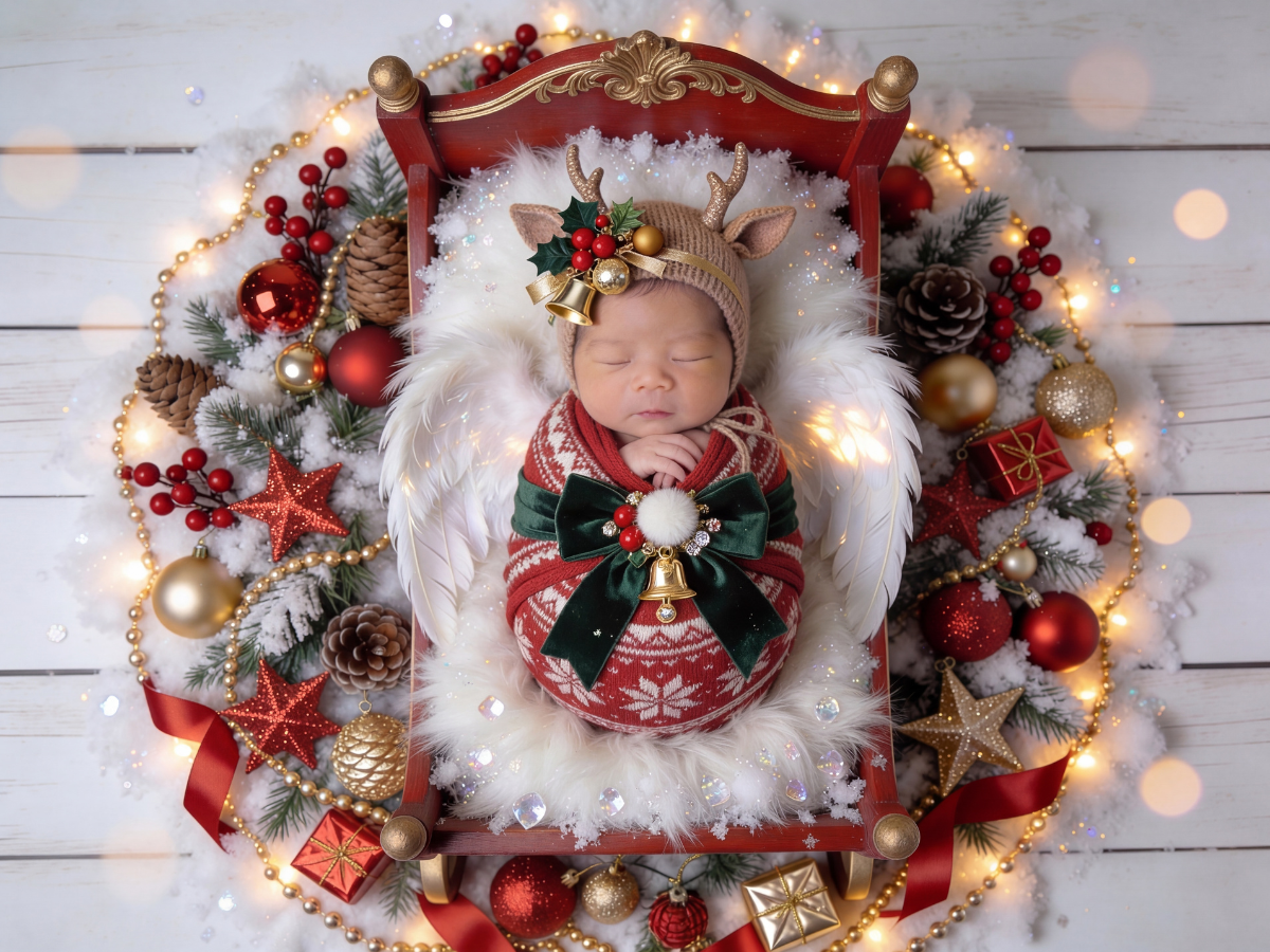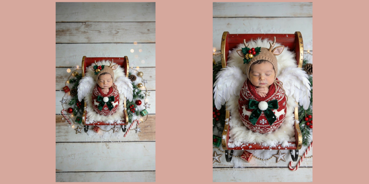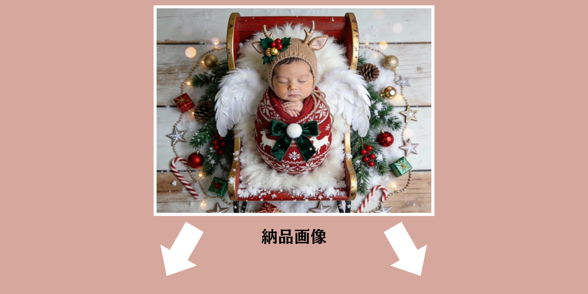 寝ている赤ちゃんの写真から、クリスマスらしい世界観に整えてニューボーンフォトを仕上げます。