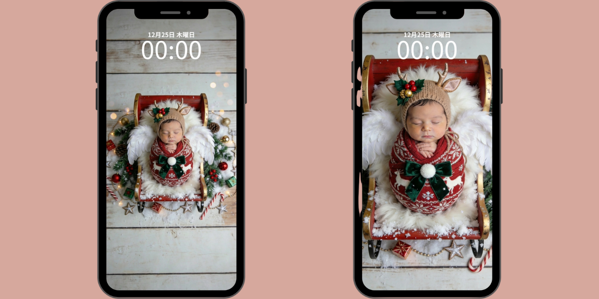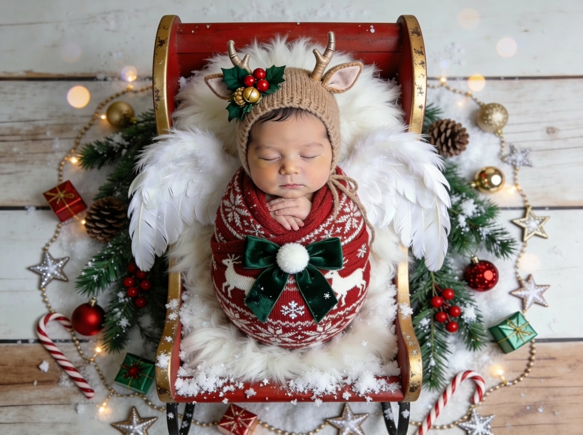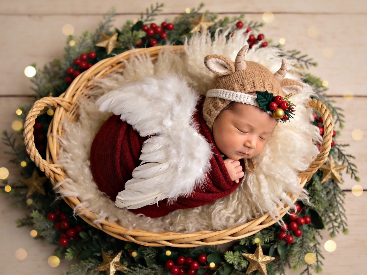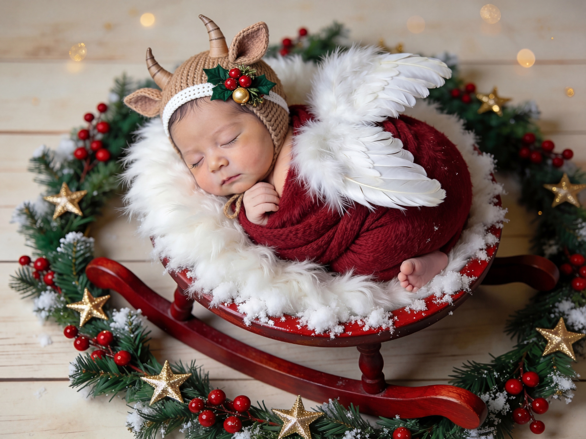 寝ている赤ちゃんの写真から、クリスマスらしい世界観に整えてニューボーンフォトを仕上げます。