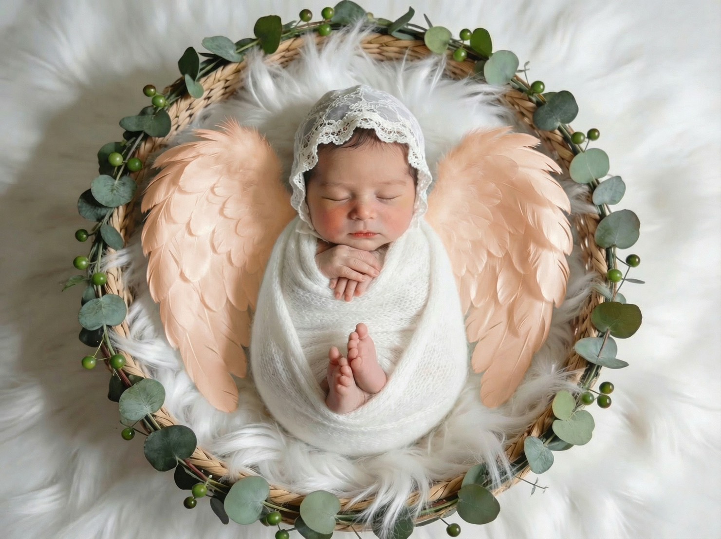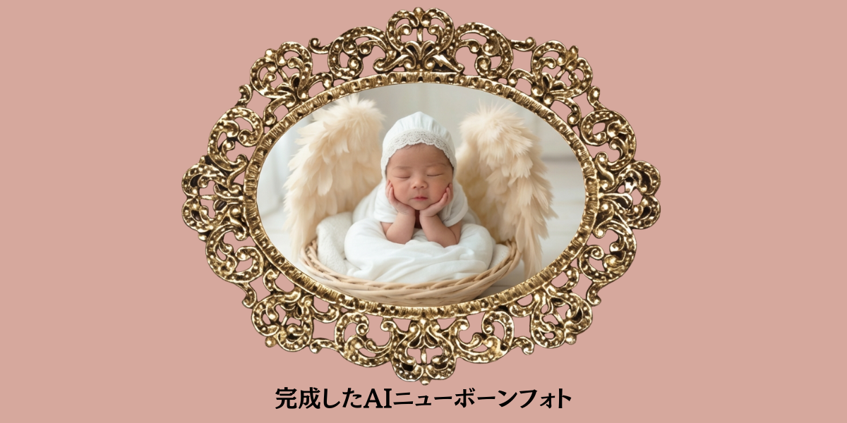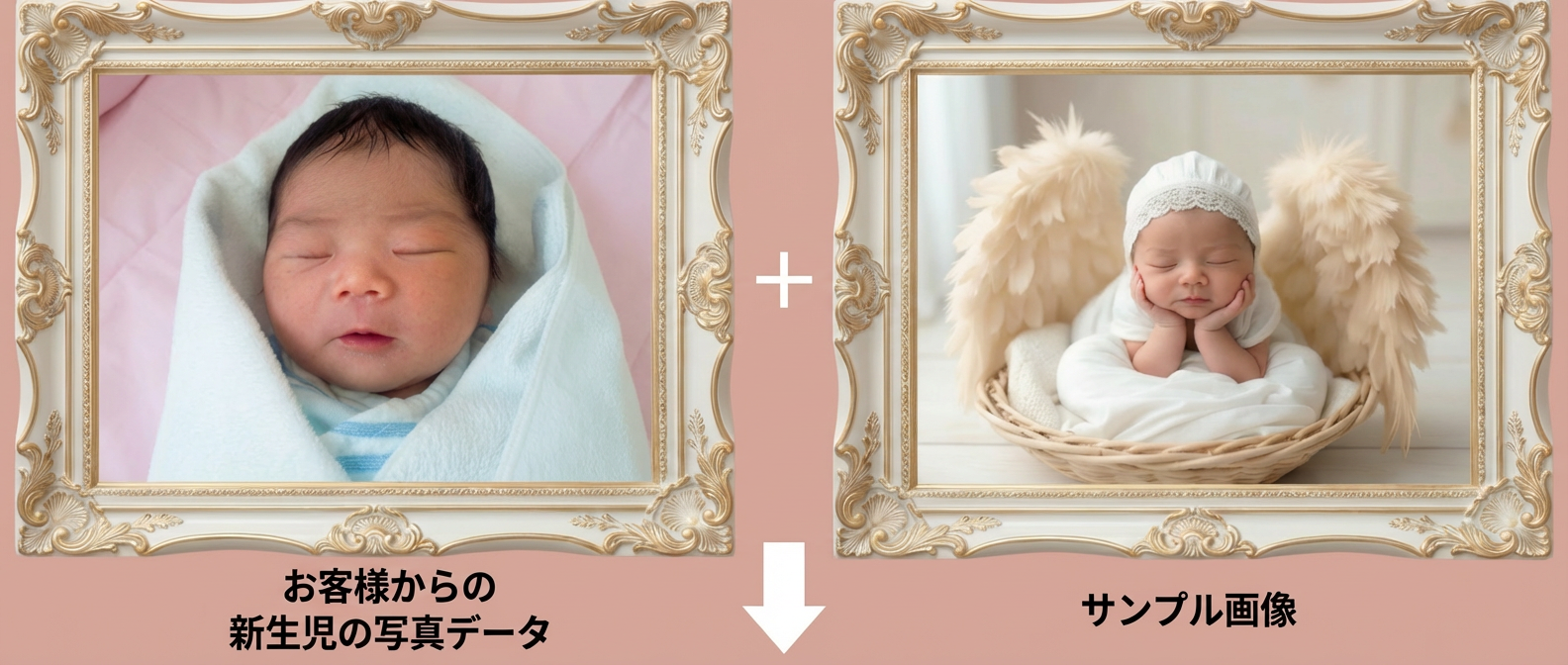 赤ちゃんの寝顔写真をもとに、羽ややわらかな布の質感をAIで丁寧に整え、天使の世界観に仕上げるプランです。